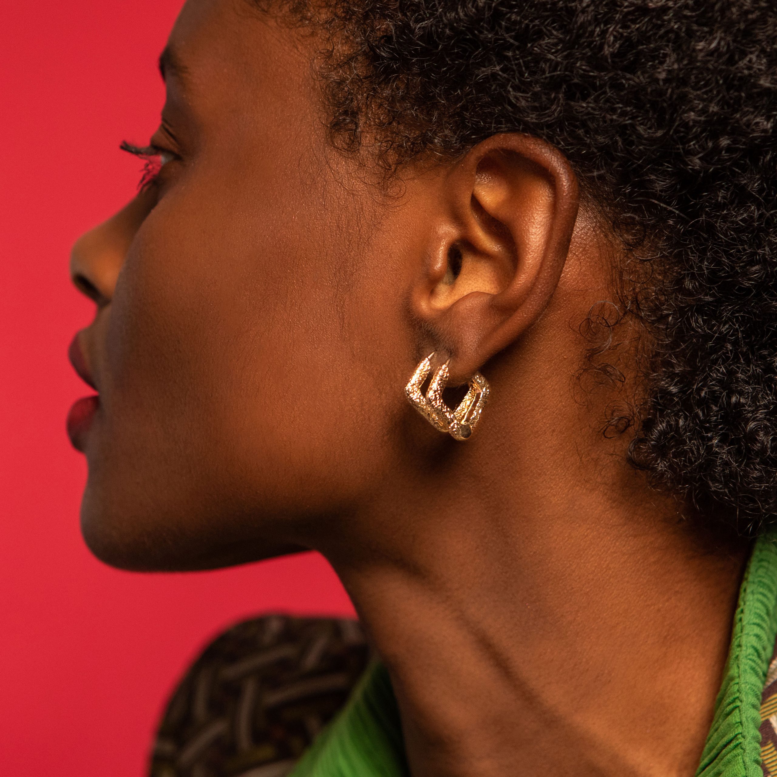 Les boucles d’oreilles Angel séduisent par leur forme carrée texturée et leur finition dorée lumineuse.