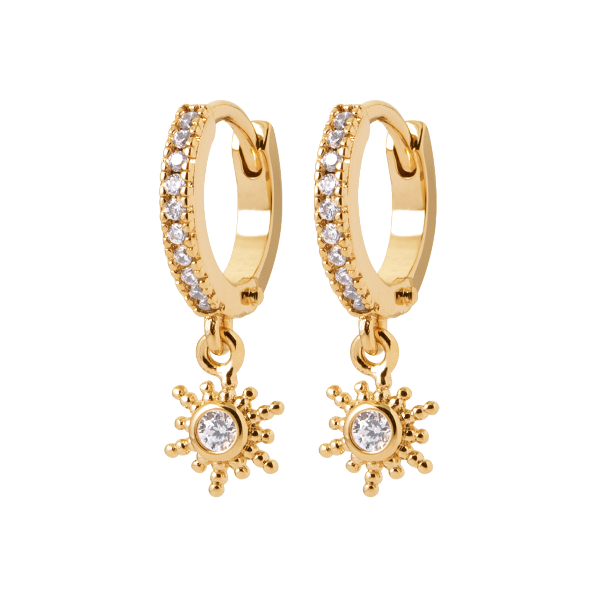 Les boucles Solea associent un anneau délicatement serti de pierres scintillantes ✨ à un pendentif soleil doré orné d’un éclat lumineux en son centre 💎