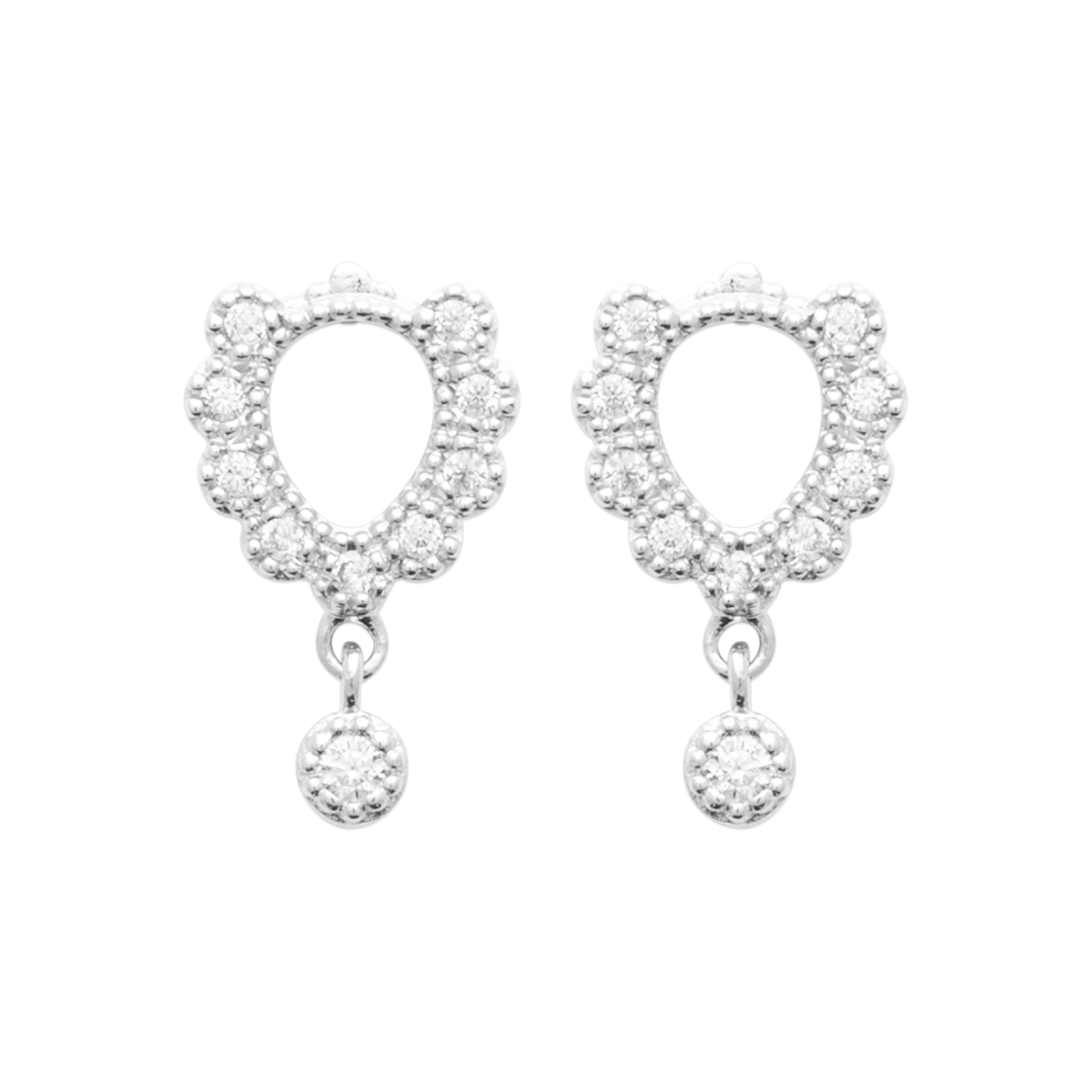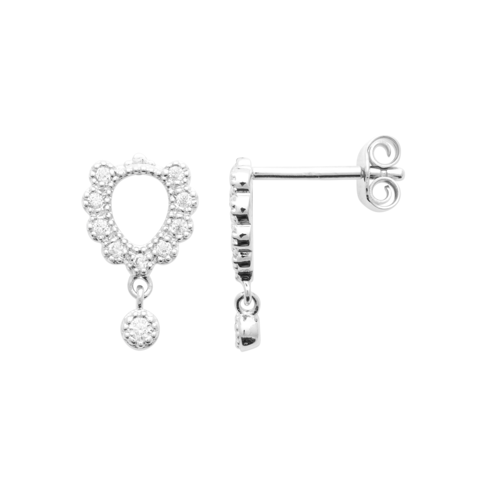 Ces boucles d’oreilles en argent 925 affichent un design délicatement ajouré, serti de micro-oxydes de zirconium pour un jeu de lumière scintillant. Leur finition élégante et leur petite pampille mobile ajoutent une touche de mouvement et de féminité, idéales pour illuminer vos tenues.