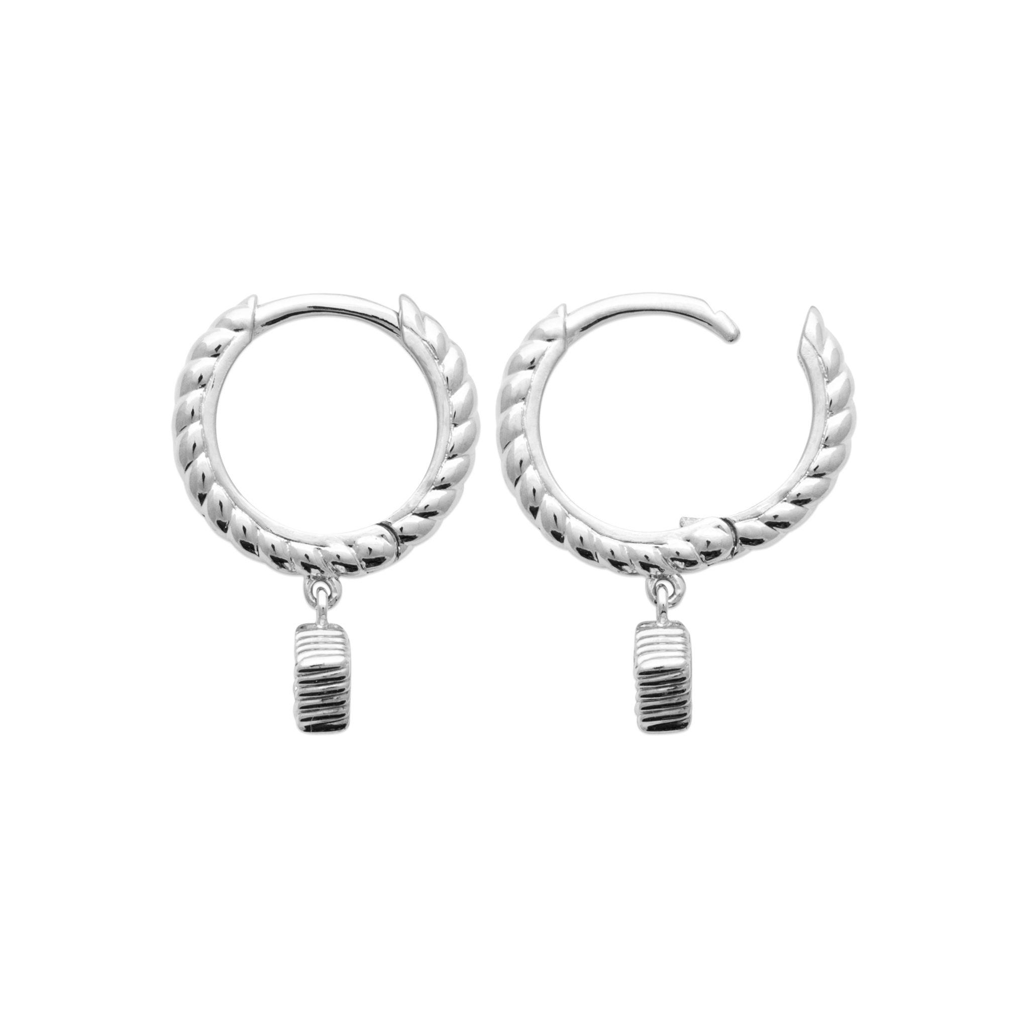 Les boucles Mila associent un anneau torsadé en argent, au relief subtil et élégant 🔗, à un pendentif carré délicatement serti d’une pierre scintillante 💎