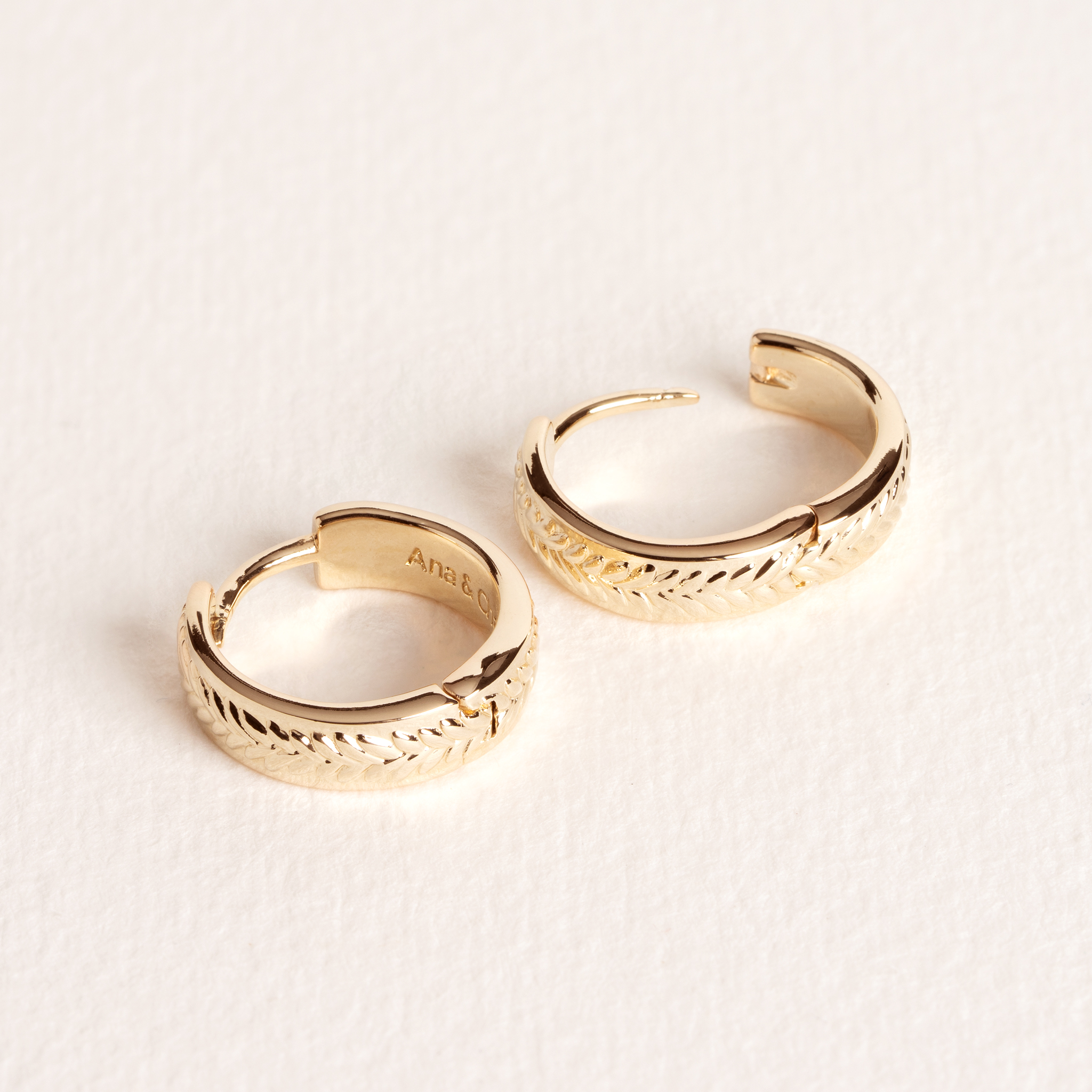 Les boucles d’oreilles Jade séduisent par leurs créoles dorées décorées d’un délicat motif feuille pour un style chic et naturel.