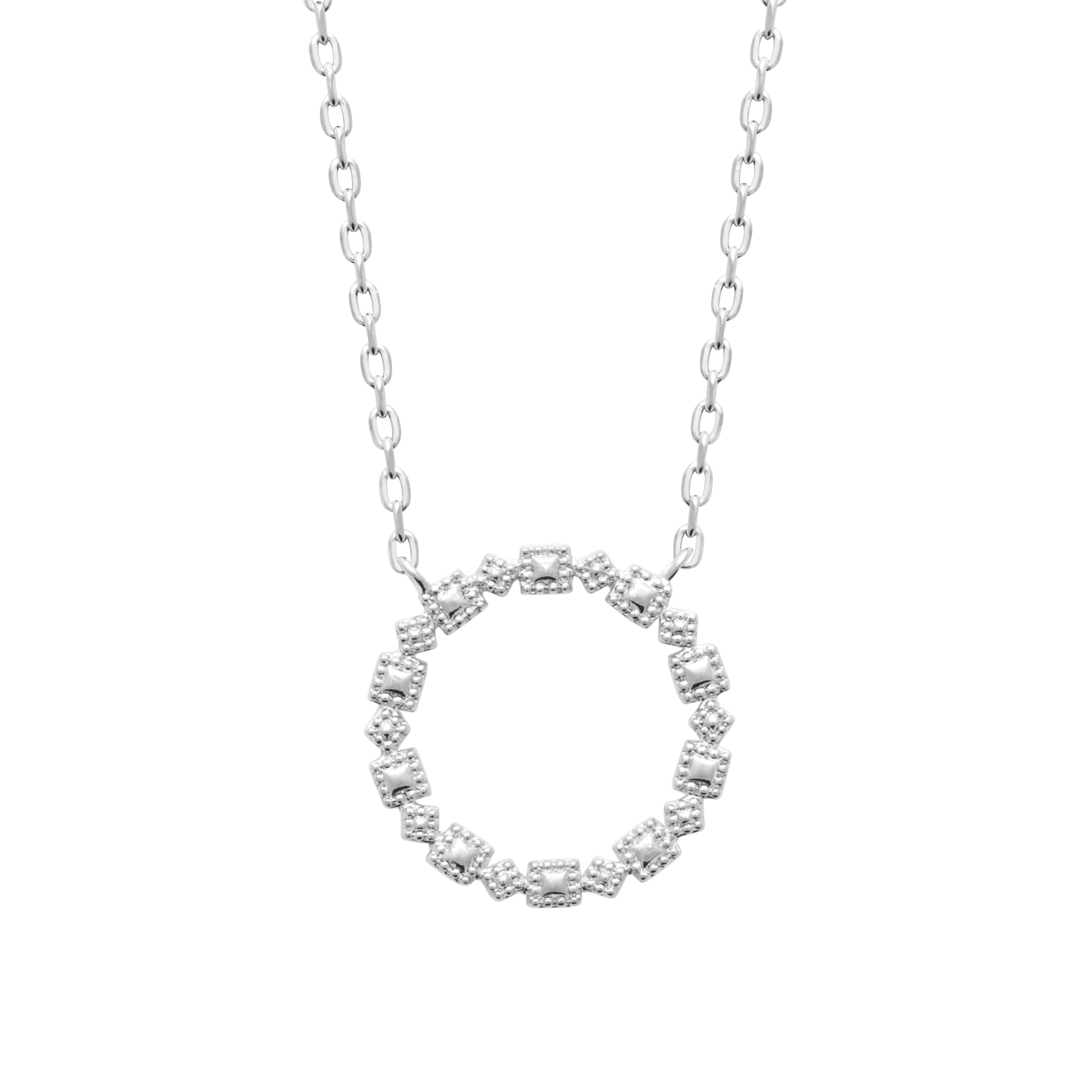 Laissez-vous séduire par ce collier raffiné en argent rhodié, orné d’un pendentif circulaire original au design géométrique. Sa structure en petits carrés délicatement pavés de pierres scintillantes lui confère une allure sophistiquée, parfaite pour rehausser vos tenues, qu’elles soient décontractées ou habillées.