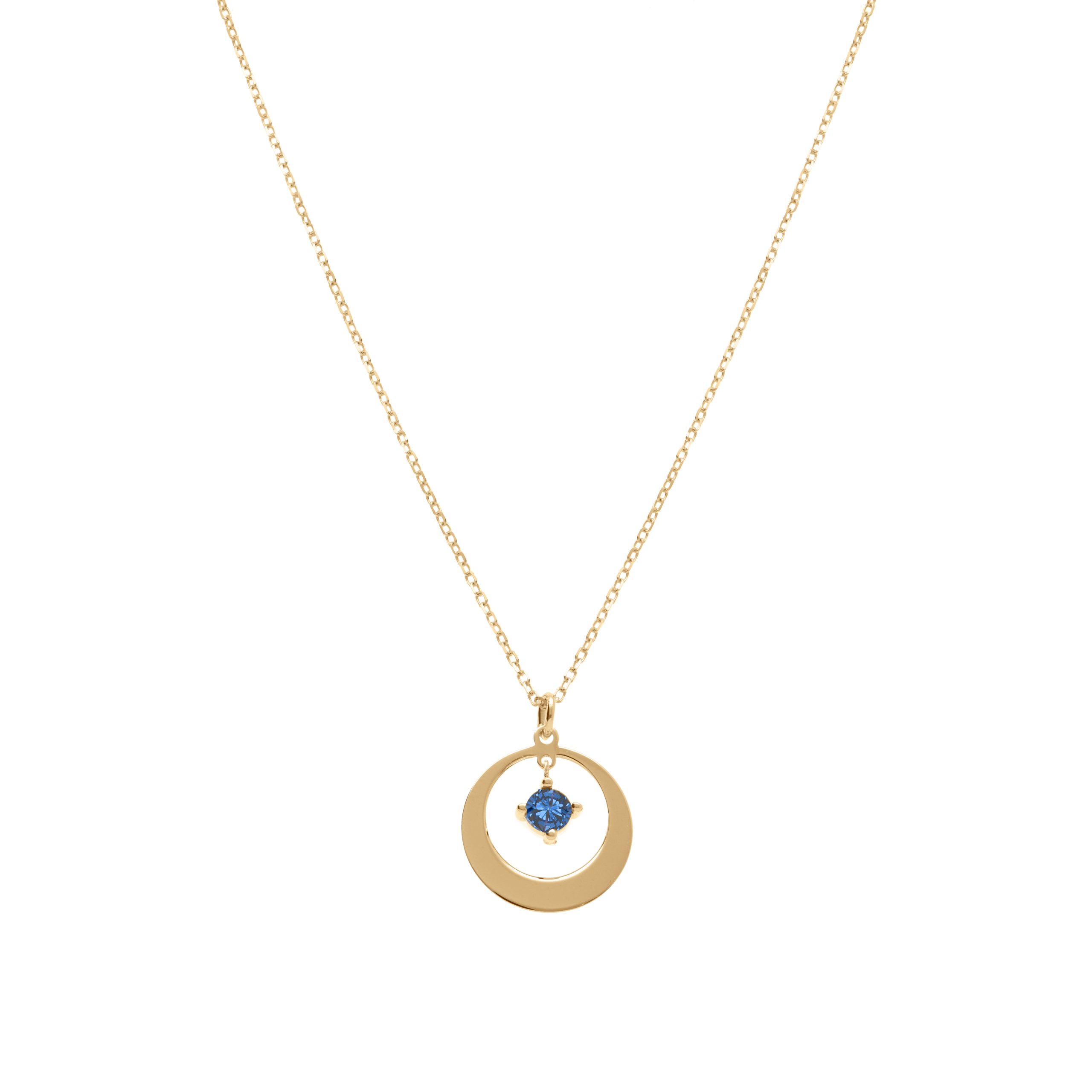 Un collier délicat où une pierre bleue lumineuse semble flotter au cœur d’un cercle doré ✨
