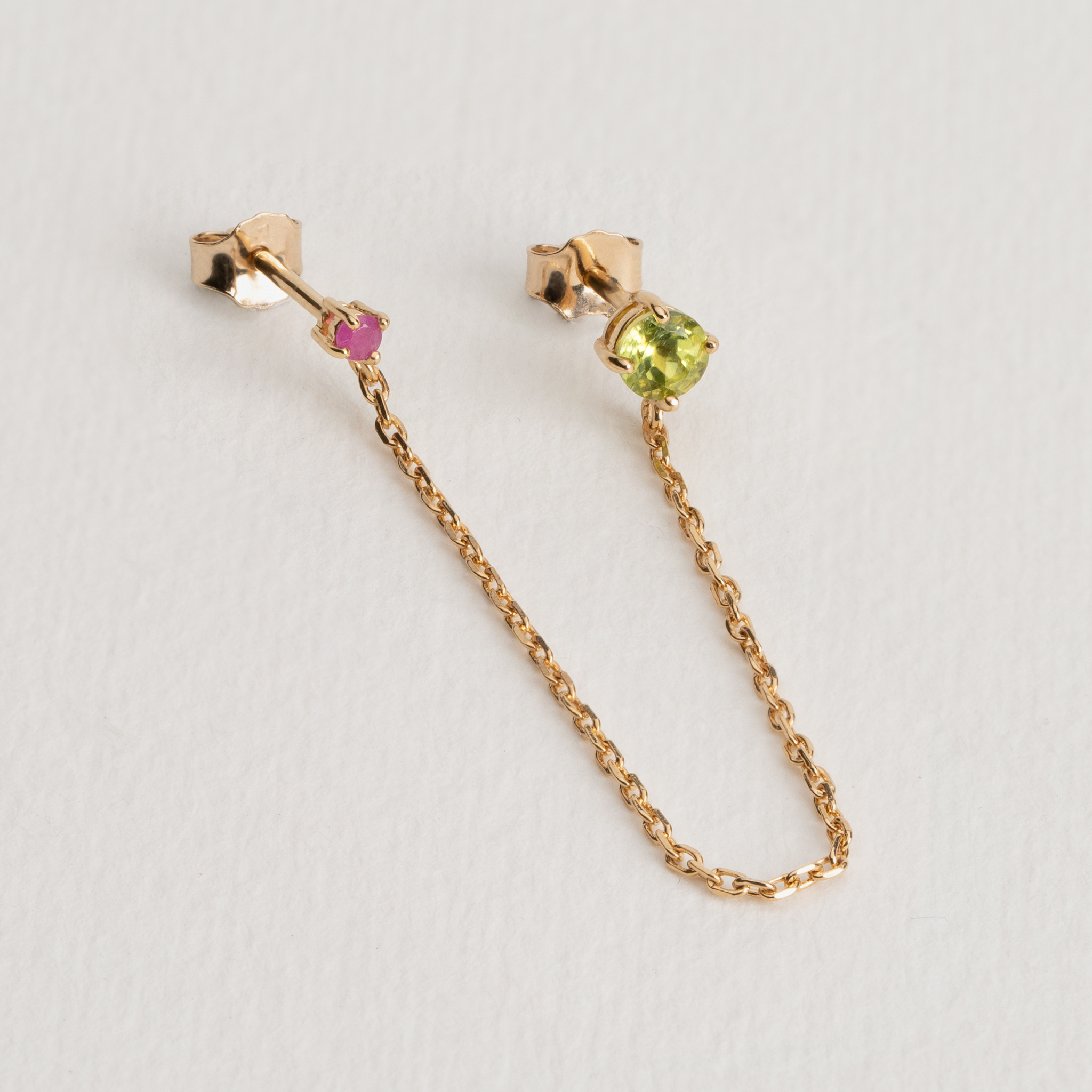 Une paire élégante et délicate, composée de deux puces asymétriques reliées par une chaînette dorée. Chaque clou est orné d’une pierre fine : un grenat rose et un péridot lumineux, pour une touche colorée et subtile.