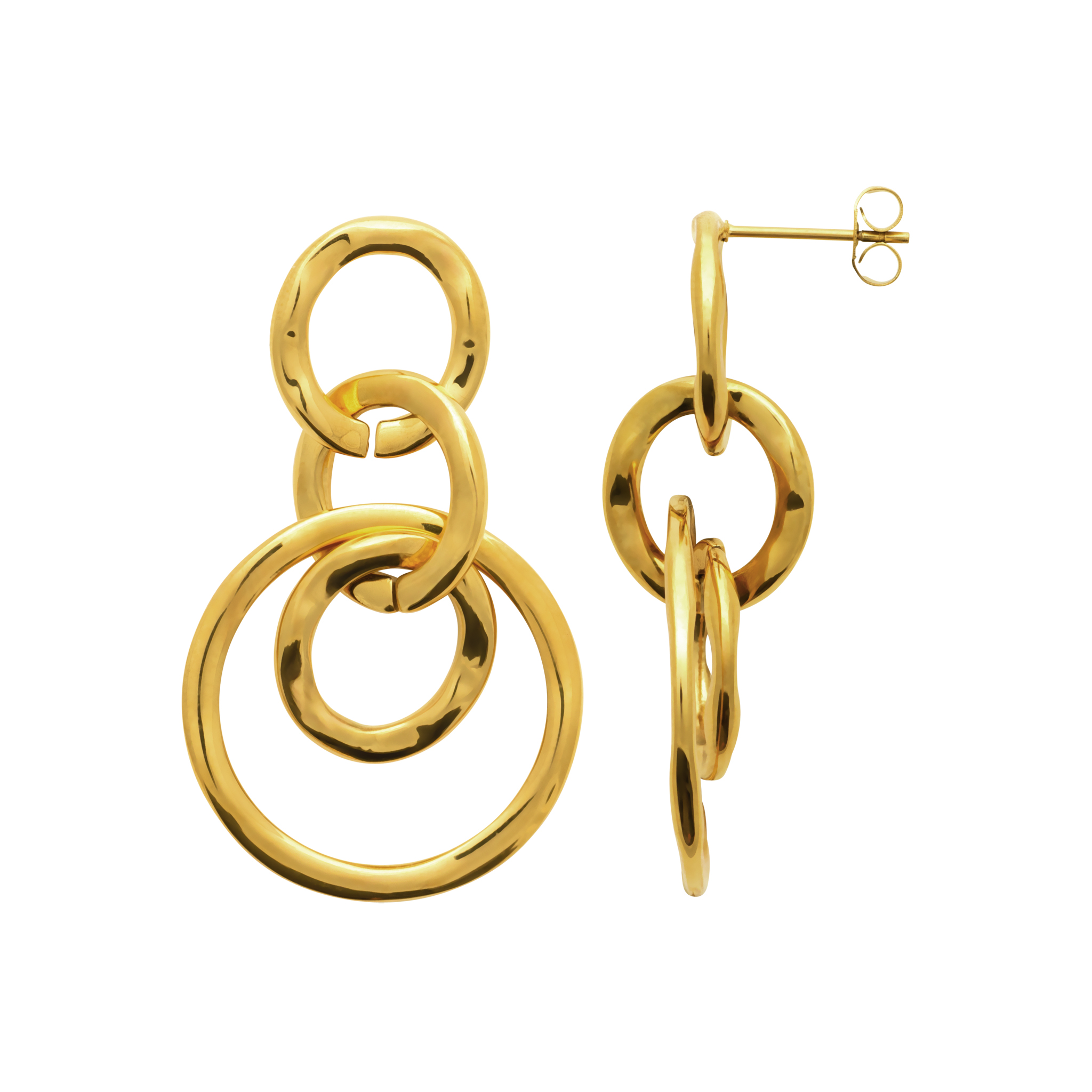 Élégantes et dynamiques, les boucles d’oreilles Golden Motion jouent sur l’accumulation d’anneaux entrelacés pour créer un design à la fois structuré et fluide. Réalisées en acier inoxydable doré, leur éclat miroir illumine le visage avec audace, dans un esprit chic et contemporain.