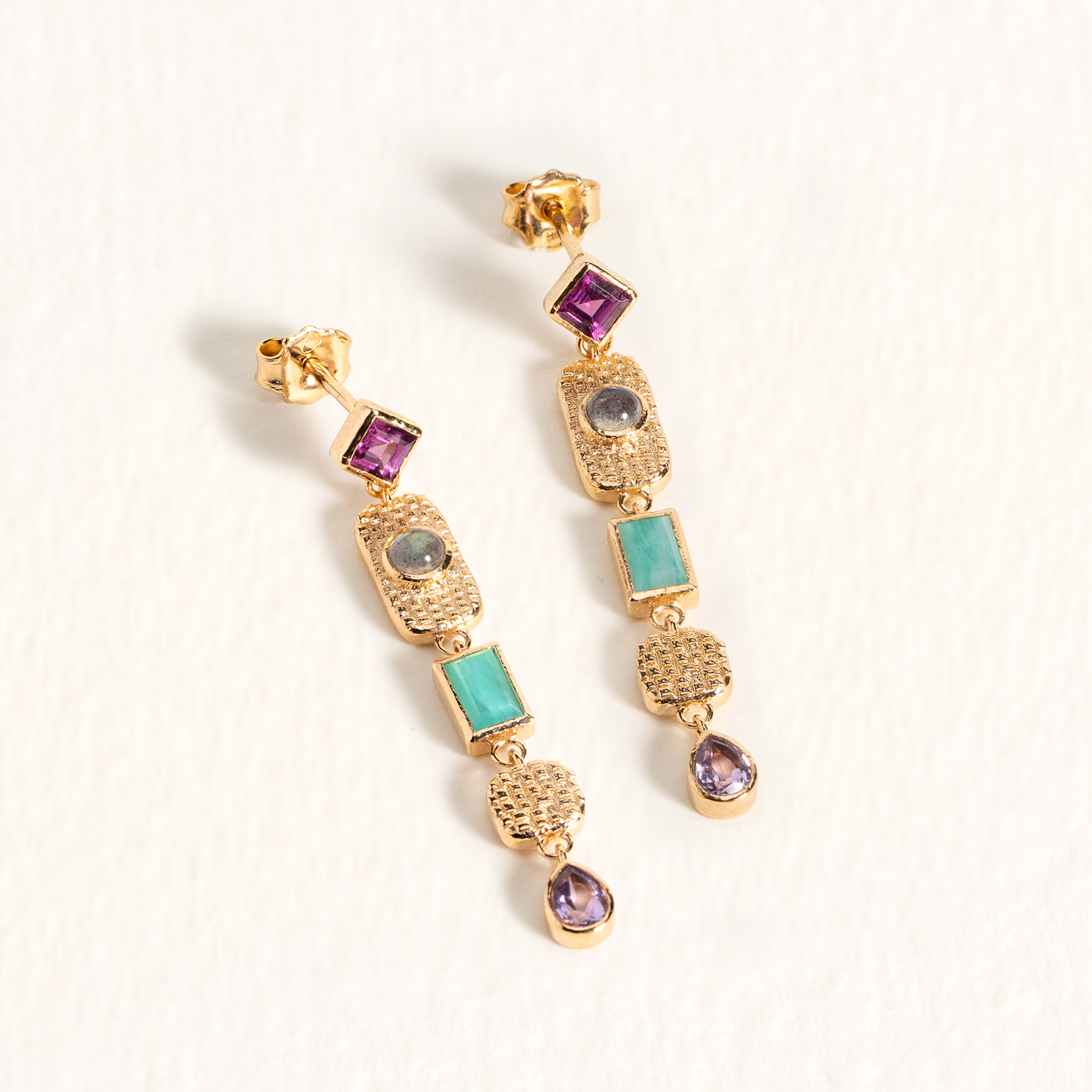 Les boucles d’oreilles Leora célèbrent la couleur, la lumière et l’audace. Réalisées en plaqué or 18 carats, elles associent harmonieusement plusieurs pierres fines naturelles aux teintes vibrantes – violet, vert d’eau, gris et lilas – créant un bijou lumineux et expressif. Leur design géométrique et texturé apporte une touche contemporaine et féminine, idéale pour celles qui aiment les pièces originales et colorées.
