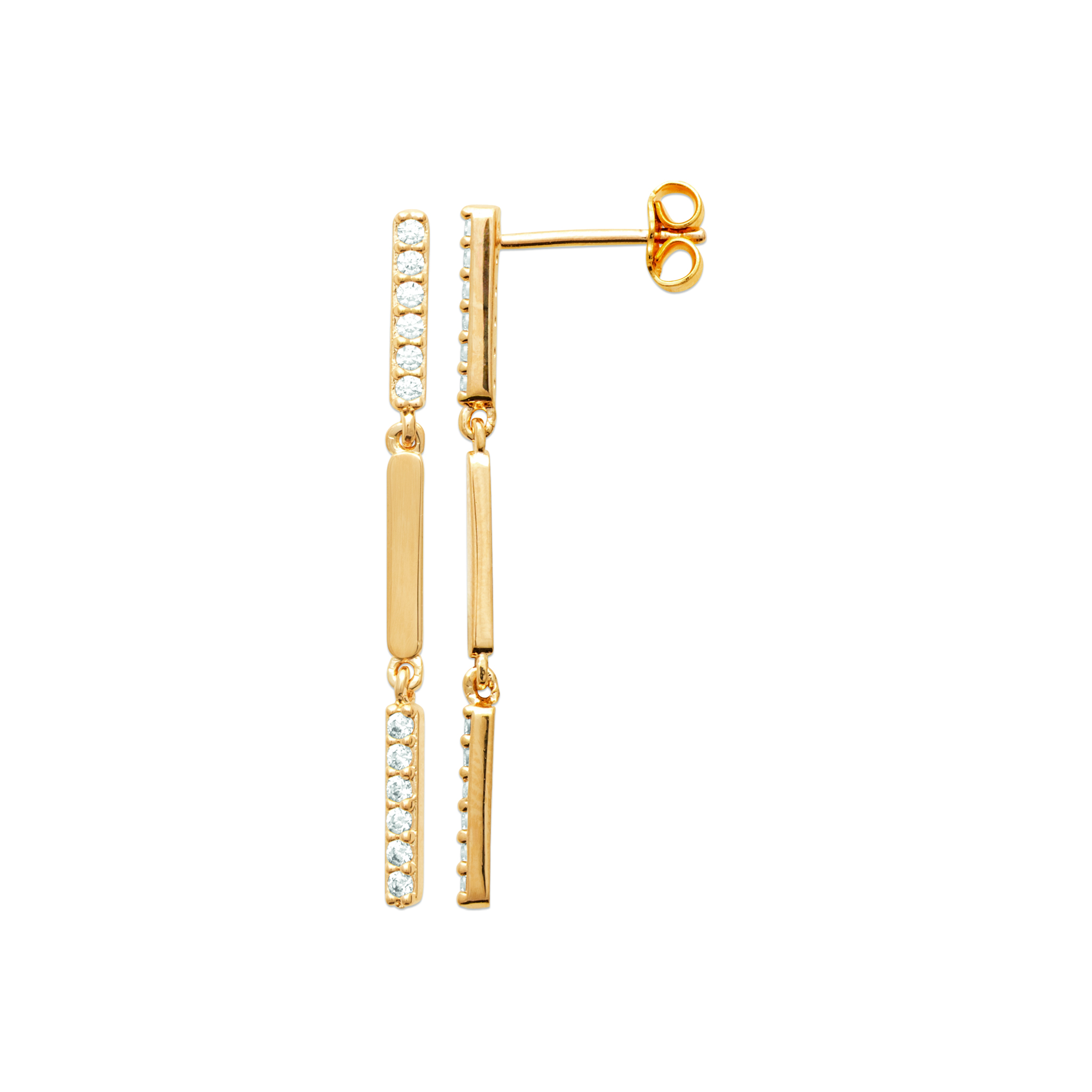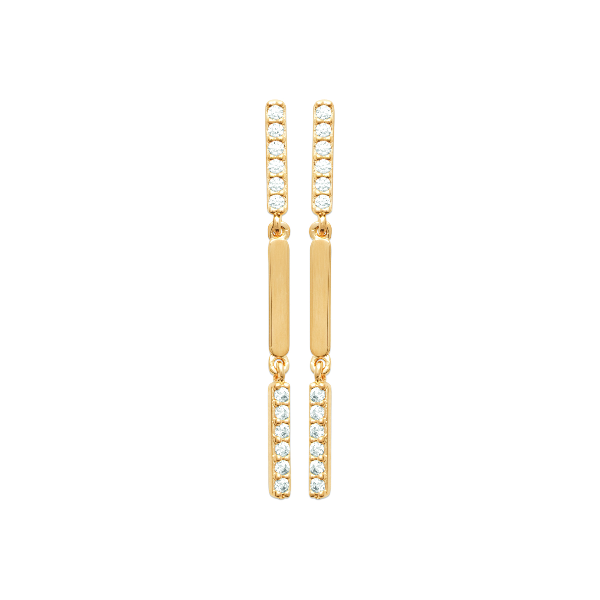 Fines, élégantes et résolument lumineuses, les boucles d’oreilles Liora incarnent la sophistication moderne. Deux barres délicatement ornées d’oxydes scintillants encadrent une tige dorée minimaliste, créant un mouvement vertical élégant qui allonge le port de tête et attire subtilement le regard.