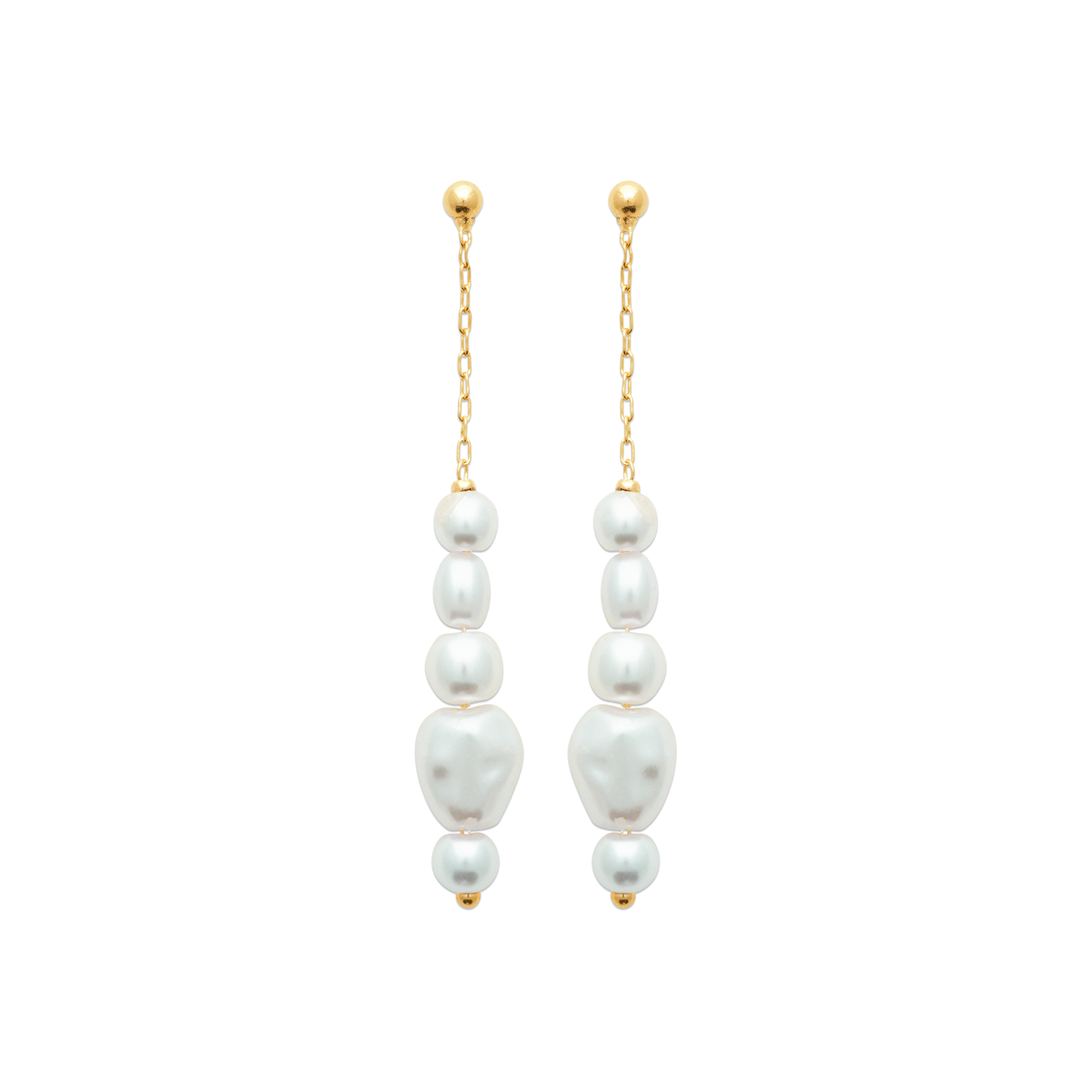 Apportez une touche de raffinement à votre style avec ces boucles d’oreilles pendantes en plaqué or, sublimées par une délicate composition de perles blanches. Suspendues à une fine chaîne dorée, les perles aux formes organiques offrent un équilibre parfait entre sophistication et naturel. Leur mouvement fluide illumine le visage avec légèreté, idéal pour sublimer une tenue chic ou apporter une touche élégante à un look décontracté. Un bijou intemporel, parfait pour toutes les occasions.