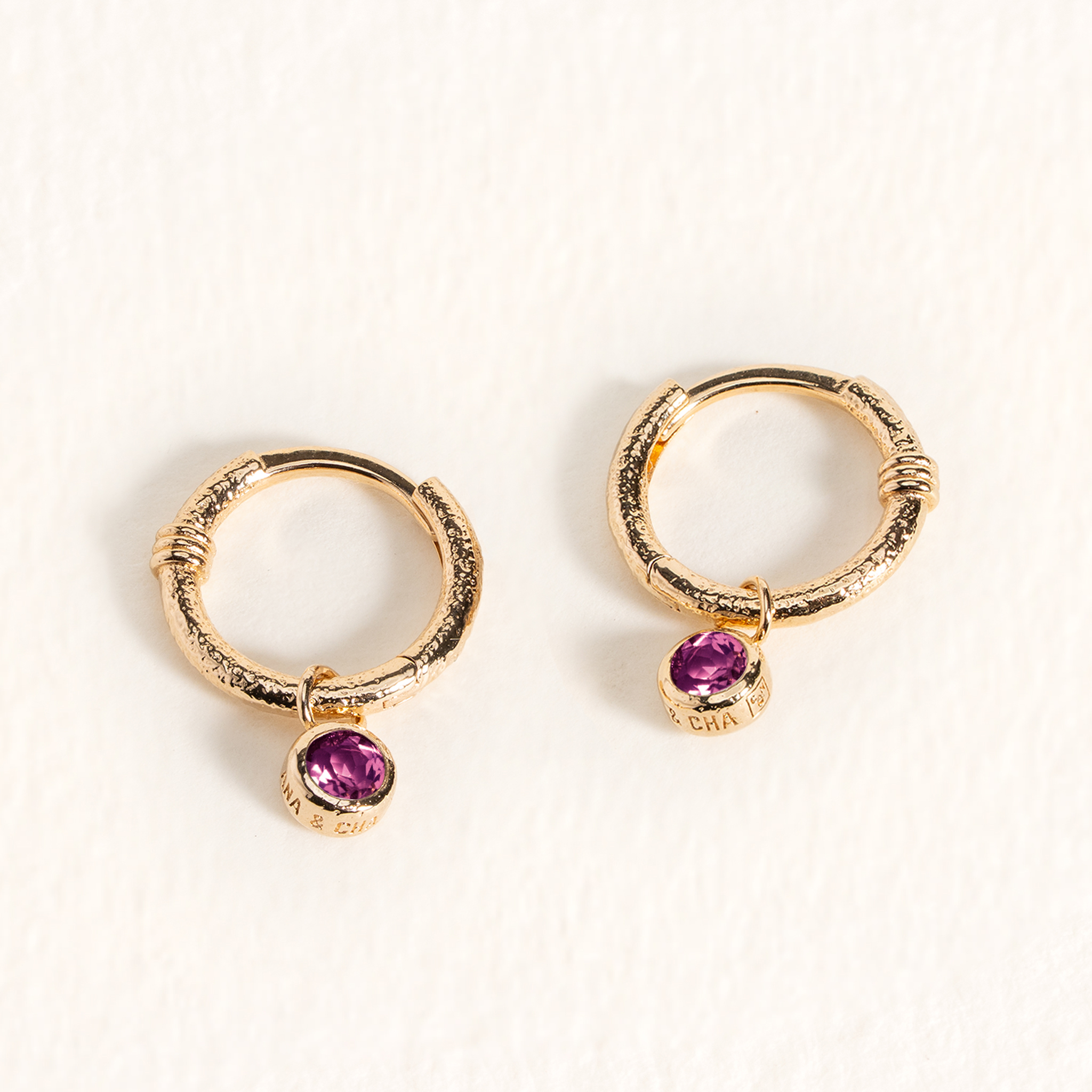 Les boucles d’oreilles Tess incarnent l’alliance parfaite entre simplicité et élégance intemporelle. Réalisées en plaqué or 18 carats, elles se composent d’un anneau délicatement texturé, orné d’un pendentif finement serti d’une pierre d’améthyste d’un violet profond, symbole de sérénité et de créativité.