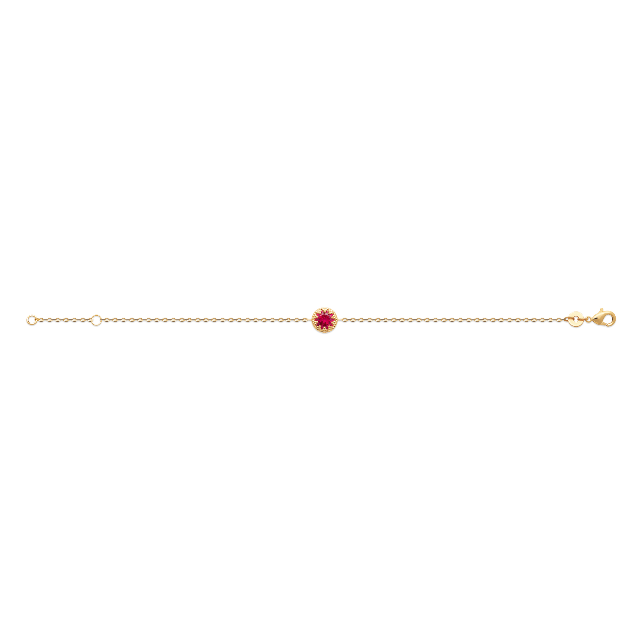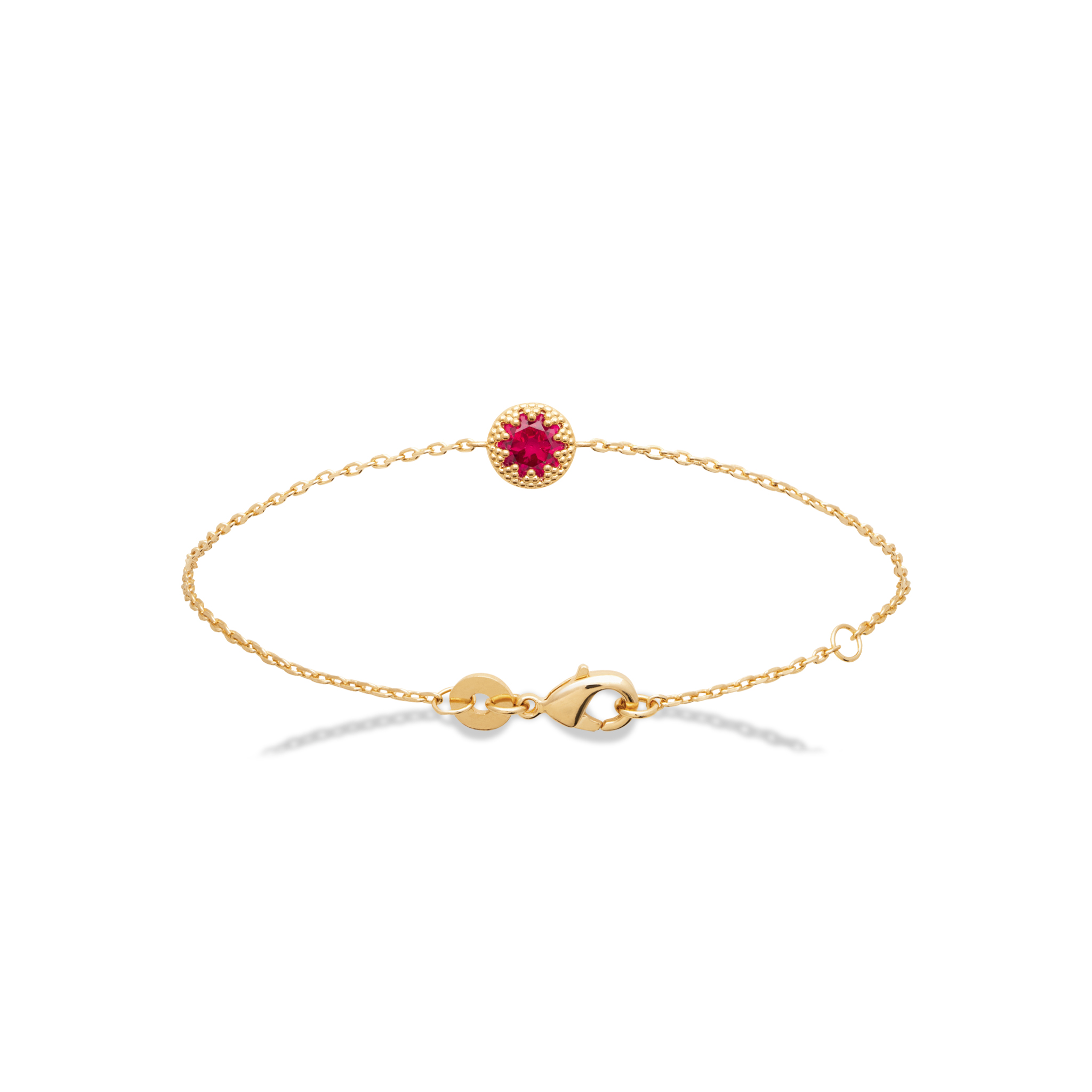 Le bracelet Ruby Aura séduit par son équilibre parfait entre finesse et intensité. Sa chaîne délicate en plaqué or 18 carats épouse le poignet avec légèreté, tandis qu’en son centre trône une pierre rouge éclatante, mise en valeur par un serti lumineux qui capte chaque rayon de lumière.