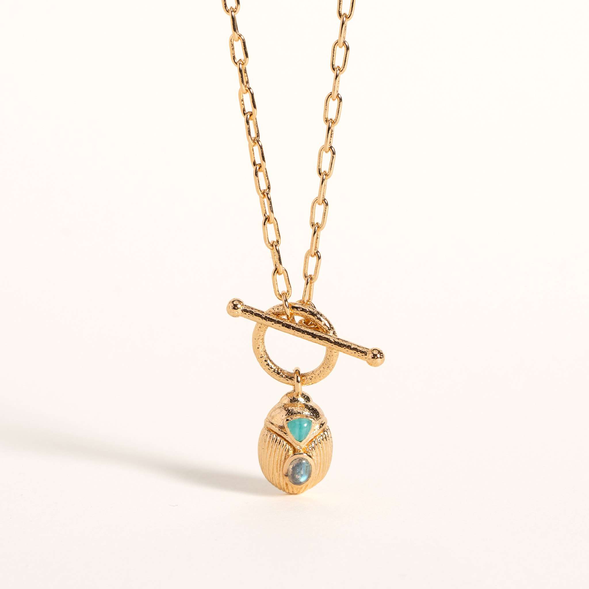 Le collier Betty célèbre l’élégance intemporelle tout en y apportant une aura mystique et lumineuse. Conçu en plaqué or 18 carats, il se démarque par son pendentif scarabée finement texturé, véritable symbole de renouveau, de protection et d’énergie positive. Au cœur de ce bijou, deux pierres naturelles se rencontrent :