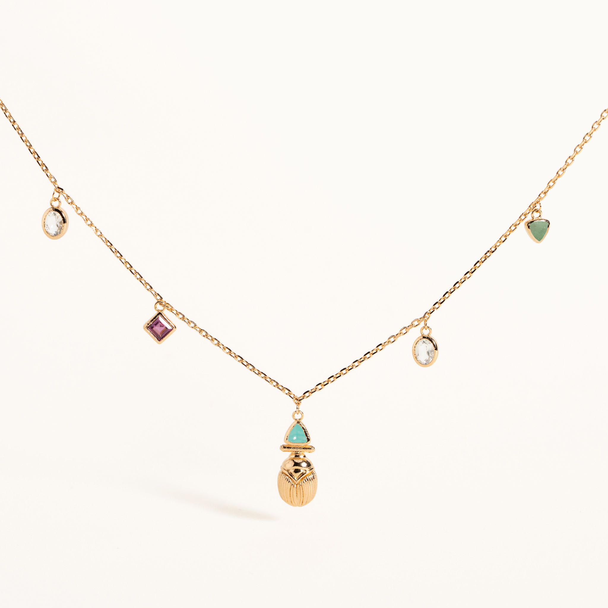 Le collier Lili est une véritable ode à la féminité poétique et raffinée. Réalisé en plaqué or 18 carats, il se distingue par son pendentif scarabée stylisé, revisité avec modernité. Ce symbole porte-bonheur, associé à la protection et au renouveau, se pare ici d’une douce harmonie de pierres naturelles : amazonite, améthyste, labradorite et cristal translucide. Leur combinaison offre un jeu de couleurs apaisantes, entre vert tendre, violet profond et reflets irisés.