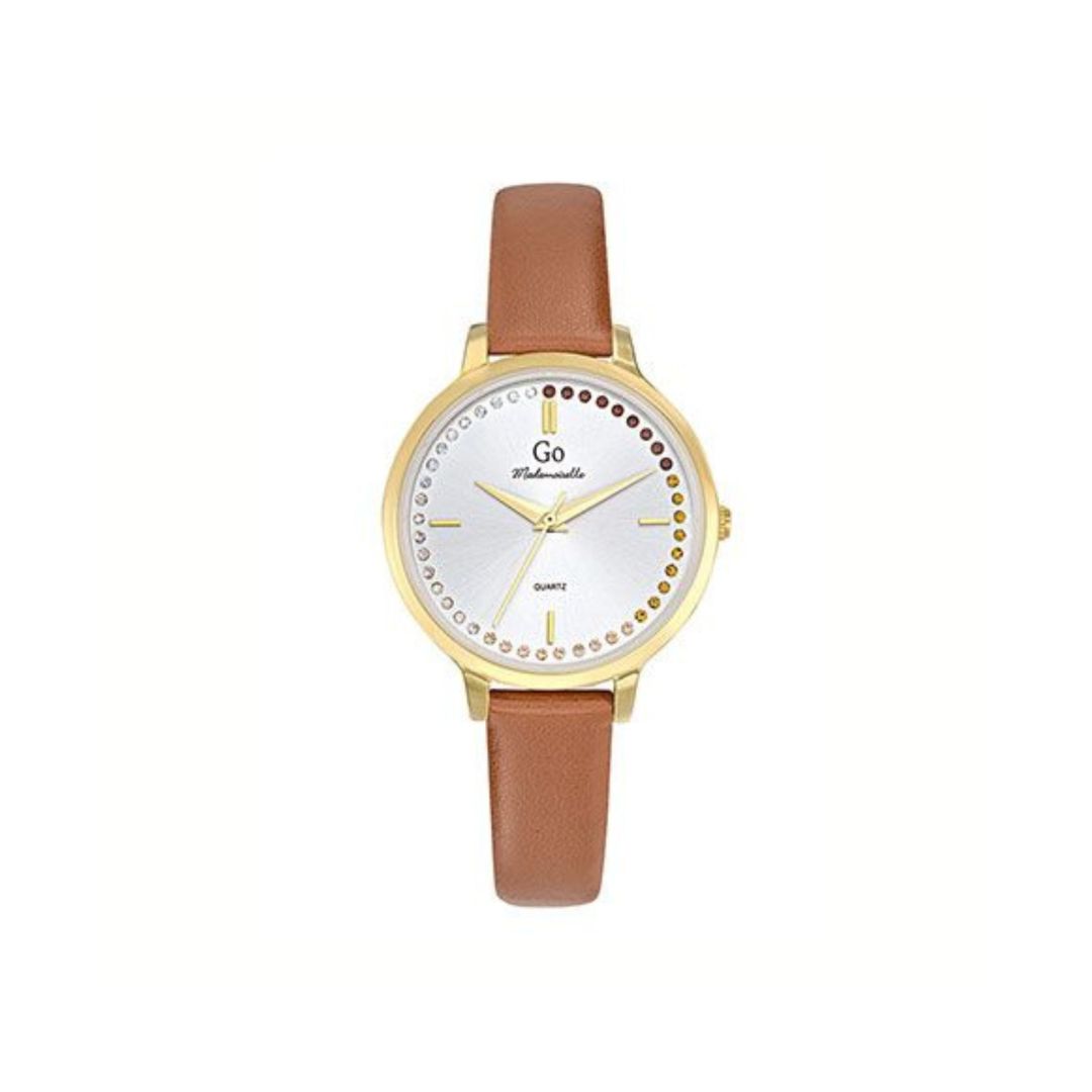 Succombez au charme lumineux de cette montre Go Mademoiselle. Son cadran argenté est rehaussé d’un magnifique dégradé de cristaux aux nuances allant du blanc éclatant à des teintes ambrées profondes, capturant la lumière à chaque mouvement. Le boîtier doré s’harmonise parfaitement avec le bracelet en cuir camel, pour un style à la fois chic et intemporel.