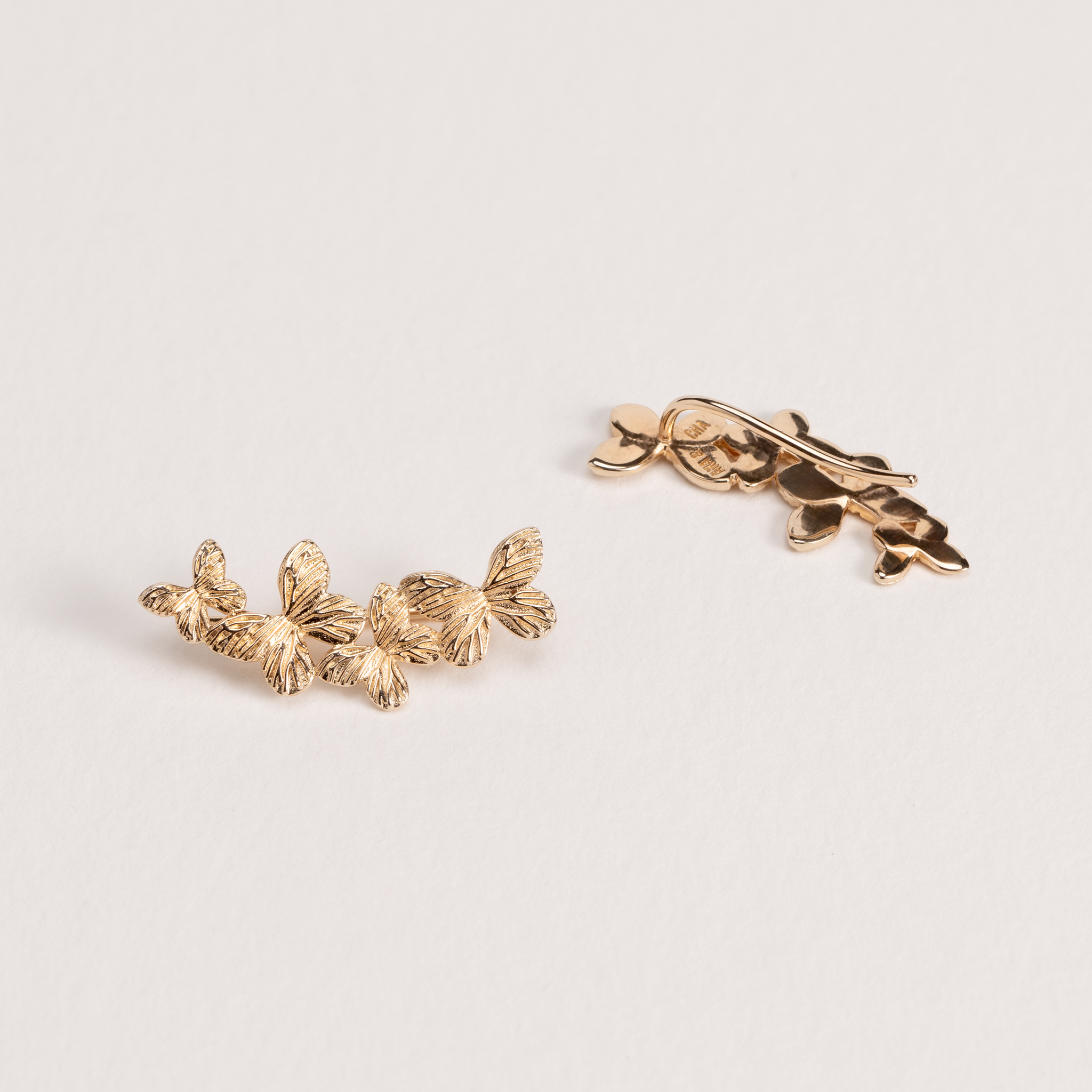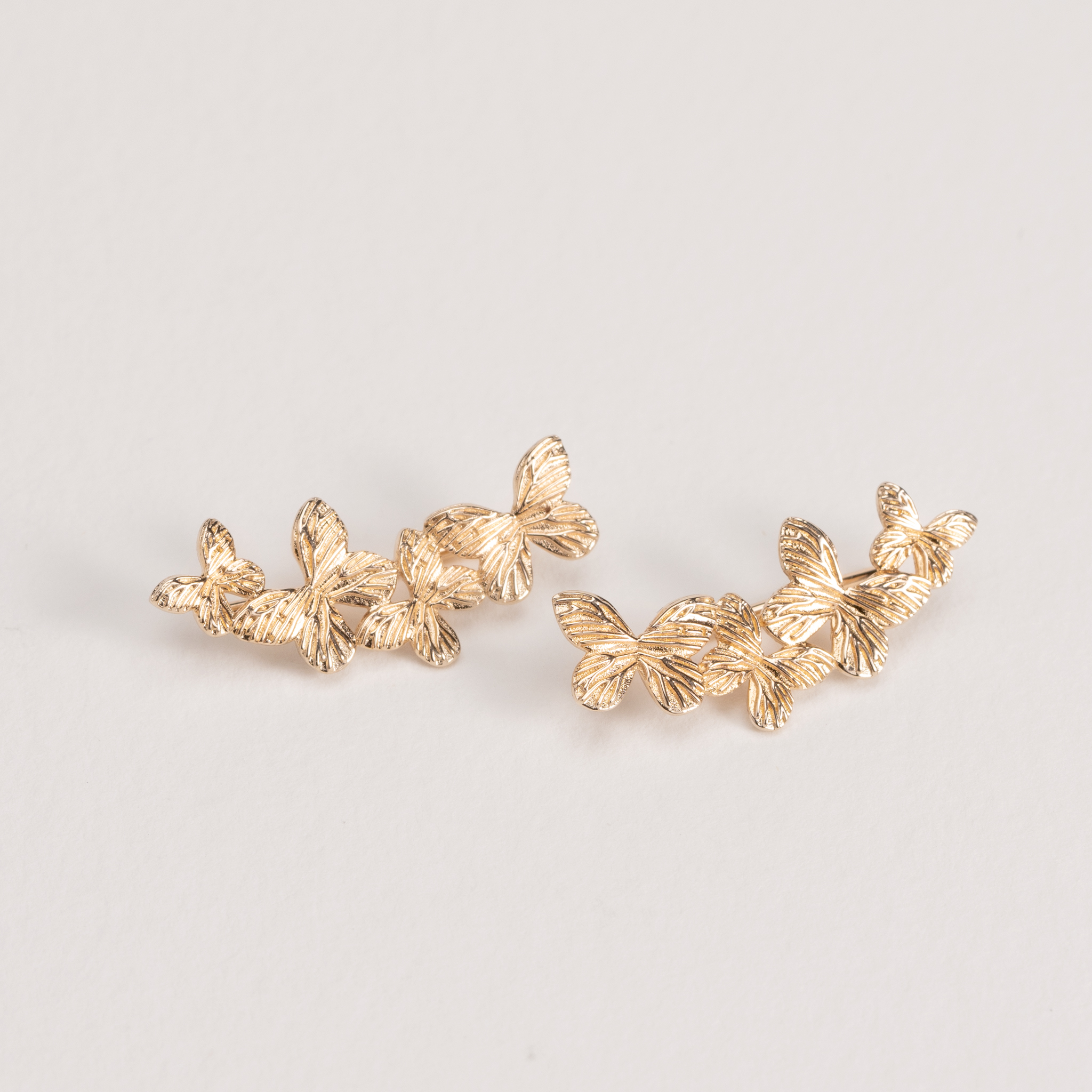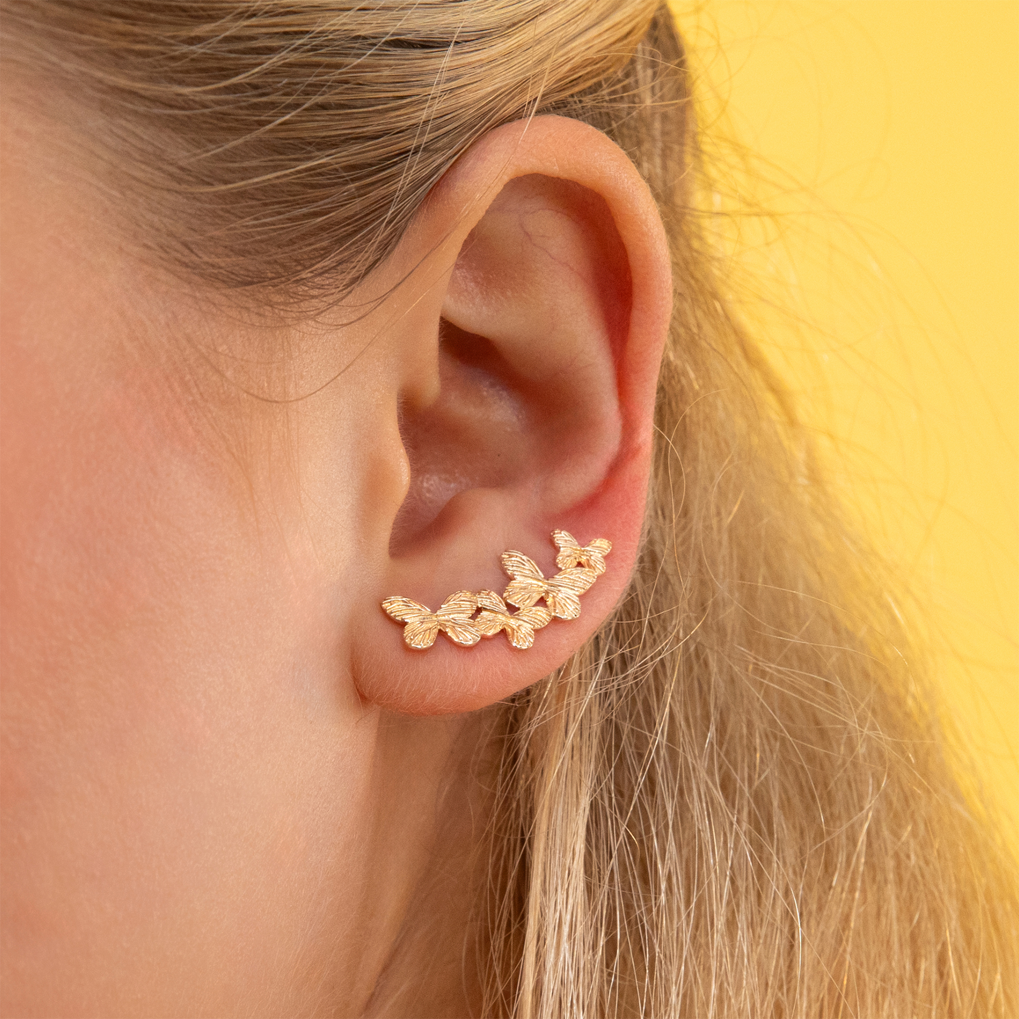Les boucles Scarlett en plaqué or subliment l’oreille avec leur élégante ligne de papillons finement texturés. Leur design “ear climber” épouse parfaitement le lobe pour un rendu moderne, féminin et plein de poésie.